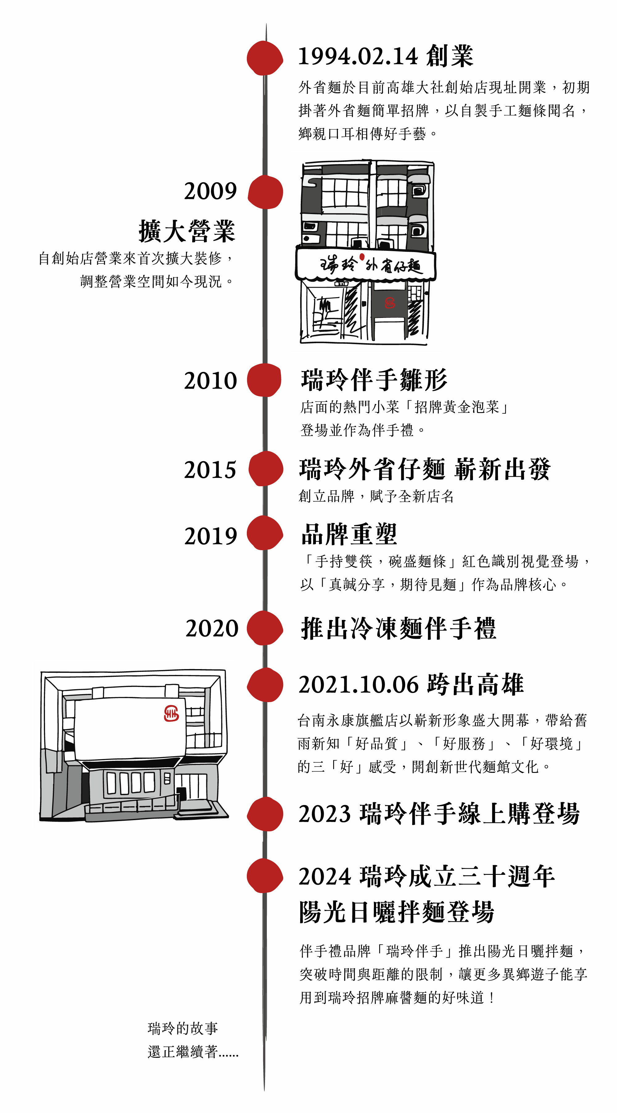 熙熙攘攘,沒有都市的繁忙,高雄大社,也有種說不上來的緊湊,軍人退伍的「連長」瑞哥與他的「牽手」玲姊,向胞弟拜師學藝,來自江西外省師傅的好手藝。1994年2月14日,大社三民路尾的林仔邊,夫妻倆租下了老房,麵攤、菜櫥、簡單的桌椅幾張,開始傳香這一碗碗看似簡單卻不平凡的「外省仔麵(GUA SING A MI)」。