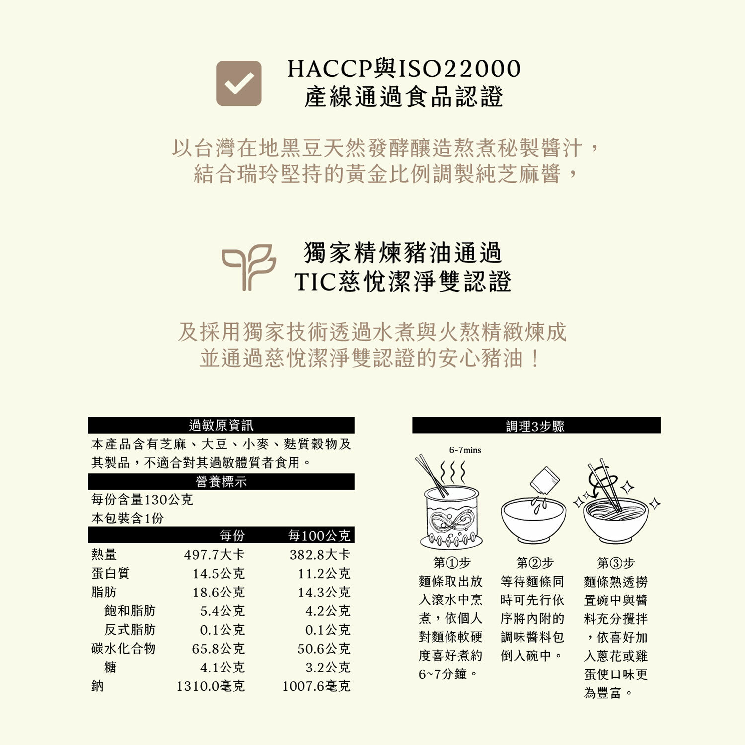 [芝麻醬包]芝麻醬、大豆沙拉油、抗氧化劑(混合濃縮生育醇)。