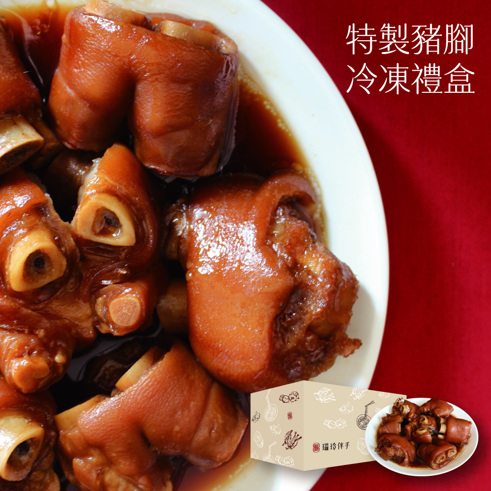 特製豬腳組合含:特製豬腳冷凍真空包650g及附滷汁1包,供電鍋加熱使用,附米色不織布禮袋。